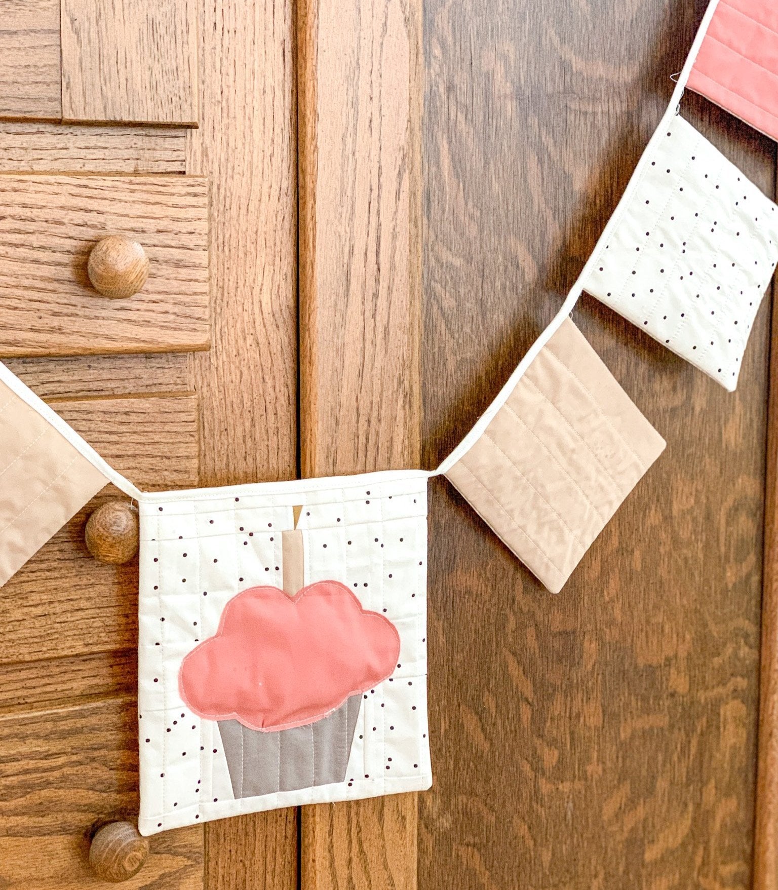 According to Dictionary.com: Appliqué is ornamental needlework in which pieces of fabric are sewn or stuck onto a large piece of fabric to form pictures or patterns. Appliqué is often used to add interest and dimension to a quilt, it can also create shapes that are not possible with traditional piecing. For example, in this Cupcake Mini Block, it would be extremely difficult to traditionally piece the top of the cupcake and even harder to create the 3D effect. That’s where appliqué comes in. In this case, after the block was pieced and quilted, the templates provided in the Cupcake Mini Block pattern were used to create the topper shape that was sewn directly onto the block and stuffed with batting to create a 3-Dimensional effect. Pretty cool, huh? If you would like to create your own version of the Quilted Birthday Banner, visit this blog post!